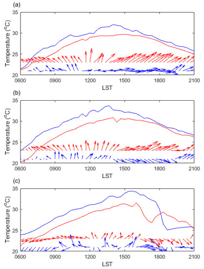 To identify the occurrence and inland penetration of sea breeze in the study case, we examined the time series of wind vectors at three stations: Gongchondong, Gimpo Airport, and Seoul on 6 July 2017 (Figure 3). The west coastline is parallel to the north–south direction (Figure 2a), and hence the sea breeze component is given by the westerly wind component [29]. The arrival of the sea breeze is easily identified as the onset of westerly flow with duration at Gongchongdong station. On the other hand, winds at the other two stations are also influenced by UHIC in the same direction as the sea breeze. To detect the SBF at the two stations, we considered an increase in wind speed. Additionally, we also checked the decrease in air temperature at Gimpo Airport station and a significant increase in the mixing ratio at Seoul station. In Figure 3, we used a black vertical line to indicate the arrival of the SBF. The onset of sea breeze occurred at 1110 LST at Gongchondong station, which is the closest to the west coast, and continued until 1800 LST. The SBF arrived at Gimpo Airport station at 1350 LST. At the Seoul station, the SBF arrived at 1550 LST, accompanied by an abrupt increase in mixing ratio from 14.9 to 16.4 g kg−1. The wind direction at Seoul station changes from westerly to easterly at 1750 LST, which is due to outflow from sea-breeze-initiated rainfall area in the east. Therefore, we confirmed that the sea breeze developed on the west coast, and the SBF arrived at Seoul on the study day.