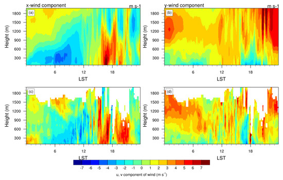 The time–height cross-section of u-component of wind for (a) CNTL simulation and (c) observation, v-component of wind for (b) CNTL simulation, and (d) observation measured by wind lidar at Gwanghwamun site from 0000 to 2400 LST on 6 July 2017.