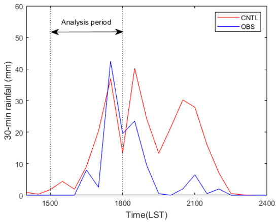 The time series of peak rain rates in the analysis domain in CNTL and observation (OBS) from 1400 to 2400 LST on 6 July 2017.