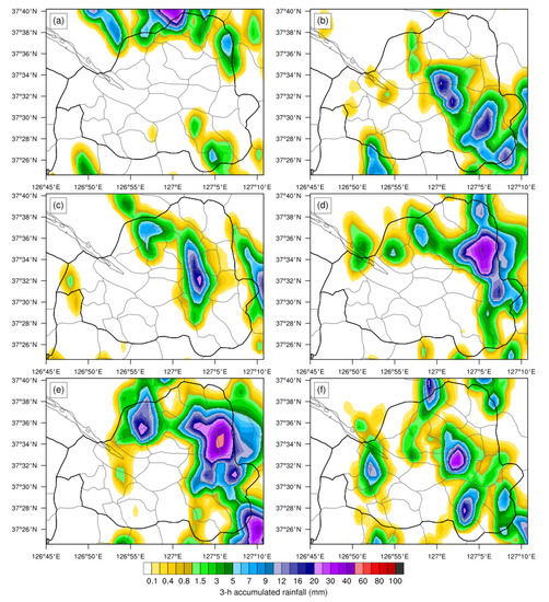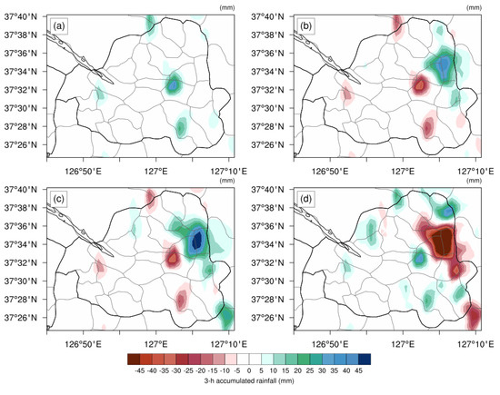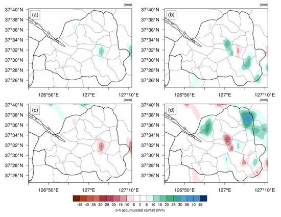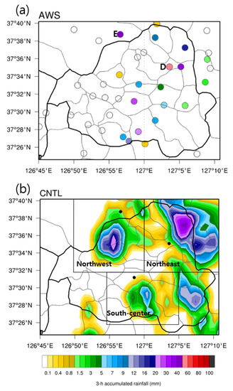 Figure 7 compares the horizontal distribution of the 3-h accumulated precipitation for the period 1500–1800 LST on 6 July between observation and CNTL simulation. Observation shows that rainfall larger than 20 mm occurred in the northeastern area, northwestern edge, and south-center of the SMA. The evaluation of high-resolution rainfall simulation is not simple. Because a model rarely simulates the exact spatial distribution of precipitating events, qualitative evaluation is common [5]. For qualitative evaluation, we focused on three stations with maximum rainfall in the northwest, northeast, and south-center of the SMA (Figure 7b) and compared them to the simulated maximum rainfall in each region. Table 4 displays the maximum 3-h accumulated rainfall in each region for observation and simulation. The simulated maximum rainfall locations do not correspond to observation counterparts (dots in Figure 7b), and location difference is provided as location error in Table 4. The model predicts the location and amount of the largest rainfall in the northeast region with small errors but underestimates rainfall by 50% in the northwest and south-central regions. The northwest rainfall location is in an upsloping region (Figure 1d), indicating that topography plays a role in triggering the rainfall. Some location errors could be due to the smoothing of terrain height on a 1 km grid and scarcity of observation stations. The model also well captures no rainfall in a flat southwestern area of the SMA. The simulated maximum 3-h accumulated rainfall in the analysis domain is 43.6 mm, which is a little smaller than observation (56.5 mm).