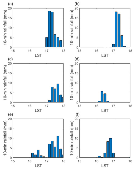 The time series of 10-min rainfall (mm) at the locations with maximum rainfall in northeastern (a,b), south-center (c,d), and northwest (e,f) in the analysis domain. (a,c,e) Observation, (b,d,f) CNTL simulation from 1500 to 1800 LST on 6 July 2017.