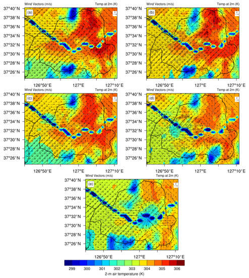 In this section, we examine how urban factors influence urban breeze and low-level convergence and thermal instability at the SBF and discuss their relation to sea-breeze-initiated rainfall. We first examined the horizontal distribution of 10 m wind vector and 2 m air temperature at 1600 LST for simulations with sea breeze (Figure 12). In the SMA, there are various local circulations such as river breeze, valley breeze, and urban breeze as well as sea breeze [12]. The strong southwesterly sea breeze is shown in the west of the SMA, and easterly flow is shown at the eastern edge of the SMA in urban simulations. High air temperature is shown over the northeastern valley of the SMA (Figure 1d), inducing strong UHIC. The shift of a UHI-related local maximum temperature zone from the city center to the inland is reported in previous studies [5,34]. This hot spot is close to the location of maximum rainfall in CNTL, LB, and NA (Figure 7b and Figure 9d,e). Because of large low-level convergence and high thermal instability, the hot spot aids in the initiation of deep convection and subsequent rainfall. The western area, on the other hand, is influenced by the sea breeze and thus has a lower temperature than the eastern area. The near-surface air temperature appears in the order of CNTL > LB > NA > NALB > NOURBAN, which implies the largest thermal instability in CNTL and the lowest one in NOURBAN. Anthropogenic heat increases the air temperature in CNTL and LB. Urban roughness increases surface sensible heat flux, leading to higher near-surface temperature in NA and CNTL than their counterparts (NALB and LB).
