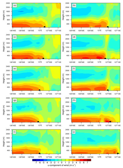 Longitude-height cross-section of meridional-averaged u-component of wind (m s−1) in analysis domain for (a,b) CNTL, (c,d) LB, (e,f) NA, (g,h) NALB, (i,j) NOURBAN at 1600 (a,c,e,g,i) and 1700 (b,d,f,h,j) LST. The black dots indicate the location of the SBF.