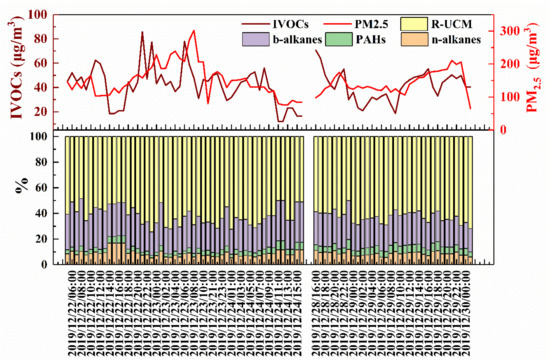 Hourly time resolution samples of IVOCs and PM2.5 were obtained during two haze episodes in Wangdu County, Hebei Province, defined as P1 (22–24 December 2019) and P2 (28–30 December 2019). The time series of the concentrations of IVOCs and PM2.5 and the ratios of IVOCs’ components during haze episodes are shown in Figure 1. The temporal variation trend of IVOCs concentration was similar to that of PM2.5 during haze episodes. However, these are not exactly consistent. The average concentration of IVOCs in P1 and P2 was 42.2 ± 14.8 μg·cm−3 (11.3~85.1 μg·cm−3) and 41.4 ± 12.2 μg·cm−3 (18.0~70.1 μg·cm−3), respectively, higher than that measured in Guangzhou (11.3 ± 7.8 μg·cm−3) [32], Yangshan Port in Shanghai during the G20 period (5.1 ± 0.8 μg·cm−3) [21], and Pasadena, California, in the summer (6.3 ± 1.9 μg·cm−3) [23], but lower than the values reported in Shanghai (58.5 ± 27.0 μg·cm−3) [22]. The concentration and fractional contributions of IVOCs components in P1 and P2 were similar. The average concentrations of n-alkanes (nC12–nC22) were 3.3 ± 1.3 μg·cm−3 and 3.6 ± 1.3 μg·cm−3, accounting for 8.2 ± 1.7% and 8.6 ± 1.6% of IVOCs, respectively. The average concentration of PAHs in P1 and P2 were 1.4 ± 0.5 μg·cm−3 and 2.1 ± 0.5 μg·cm−3, accounting for 3.6 ± 1.1% and 5.3 ± 1.0% of IVOCs, respectively. The average concentrations of b-alkanes (B12~B22 bins) in P1 and P2 were 10.4 ± 4.4 μg·cm−3 and 9.6 ± 3.2 μg·cm−3, accounting for 25.8 ± 4.5% and 23.2 ± 2.6% of IVOCs, respectively. R-UCM accounted for 85.6 ± 2.4% and 87.0 ± 2.8% of the IVOCs’ concentration in P1 and P2, respectively, which were similar to the case in Guangzhou [32]. Overall, the concentrations (fractional contributions to IVOCs mass) of n-alkanes, PAHs, b-alkanes, and R-UCM were 3.4 ± 1.3 μg·cm−3 (8.6 ± 2.3%), 1.7 ± 0.6 μg·cm−3 (6.8 ± 2.2%), 10.1 ± 3.9 μg·cm−3 (24.1 ± 3.8%), and 25.7 ± 9.9 μg·cm−3 (60.5 ± 6.5%) during haze episodes, respectively.