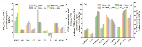 Characteristics of gaseous precursors, IVOCs components, and contribution to SOA at different pollution stages. (a) The concentration of PM2.5, IVOCs, SO2, NO2, CO, and O3 and meteorological parameters such as WS, RH, and T; (b) the concentration of n-alkanes, PAHs, b-alkanes, R-UCM, and SOA, and the corresponding ratios in IVOCs.
