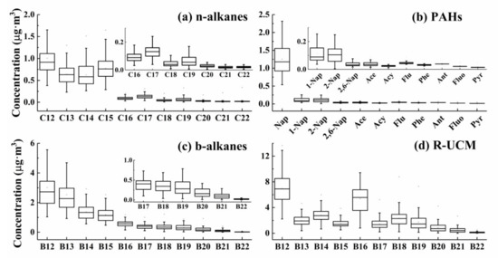 Component concentrations of (a) n-alkanes, (b) PAHs, (c) b-alkanes, and (d) R-UCM. (The top to the bottom of the box chart represents the maximum, quartile, median, lower quartile, and minimum of the concentration of each species. B-alkanes and R-UCM are the parts of each bin with the same X-coordinate axis).