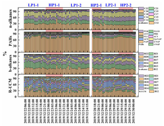 Temporal variations of different individual species in each type of IVOCs are shown in Figure 4. We defined the cases with PM2.5 > 150 μg·cm−3 as the period of heavy pollution (HP, shown in the red background area in Figure 4), and others were defined as light pollution (LP) stages. The total concentration of IVOCs in HP (49.3 ± 12.4 μg·cm−3) was higher than that in LP (38.8 ± 10.3 μg·cm−3). The relative contributions of each IVOC component varied in HP and LP during two haze episodes are listed in Table S5. During the P1 haze, the proportion of n-alkanes, PAHs, and b-alkanes in LP was higher than that in HP, contrary to the component characteristics of P2 haze.