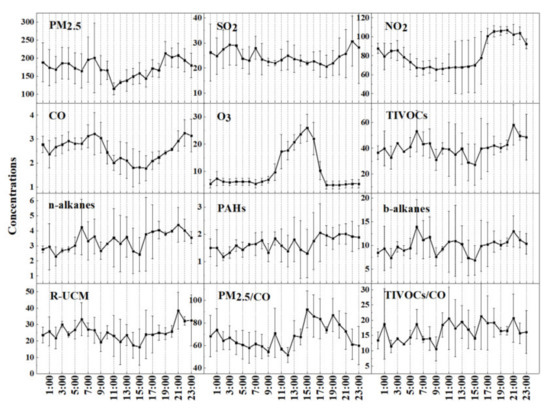 The diurnal variation of IVOCs, especially n-alkanes, b-alkanes, and R-UCM, was generally consistent with those of PM2.5, showing a lower concentration during the day (7:00~19:00) than that at night (20:00~6:00), which might be attributed to the influence of boundary layer height. IVOCs, n-alkanes, b-alkanes, and R-UCM had two peaks at 6:00 to 8:00 in the morning and 18:00 to 21:00 in the afternoon, corresponding to the morning and evening rush hours of vehicles. This was also consistent with the diurnal variation of the concentration of VOCs and NO2 in the regional atmosphere, which showed “bimodal” distributions [34,35,36], indicating that vehicular emissions were a non-negligible emission source. Furthermore, since the sampling site is close to the national highway, vehicle emissions during the morning and evening exhibited more significant contributions to IVOCs. However, it is difficult to distinguish the contribution of GV and DV to IVOCs. The concentration of SO2 at nighttime (26.6 ± 2.4 μg·cm−3) was generally higher than that during the daytime (23.1 ± 1.8 μg·cm−3), which might be attributed to the increased heating activities under low temperatures at night, leading to increased emissions from CC. Similarly, the concentration of CO at night was higher than that during the day. However, the diurnal variation of PAHs was relatively stable without peaks and valleys, which might be due to the synergic effects of vehicle sources during the day and combustion sources at night. In addition, IVOCs, n-alkanes, b-alkanes, and R-UCM appeared to have a low value between 13:00 and 16:00 due to the increased daytime illumination, O3 concentration, and the intensity of the photochemical reaction; IVOCs were oxidized into SVOCs or SOA [23]. Moreover, the IVOC/CO ratio also peaked at 11:00–15:00, indicating that the contribution of secondary components of IVOCs increased during this period. The PM2.5/CO ratio also peaked from 13:00 to 16:00, indicating that the proportion of secondary components in PM2.5 increased significantly during this period due to the strong light and atmospheric photochemistry.