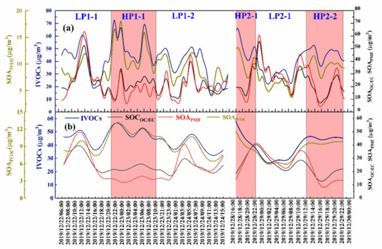 IVOCs are important precursors of SOA, and SOA production estimated with different methods (e.g., SOAIVOCs, SOAOC/EC, and SOAPMF) as mentioned in Section 2.3 is presented in Figure 6. It is clear that the variation in the trend of SOAIVOCs estimated based on IVOCs was similar to that of IVOCs. SOAIVOCs production in HP (10.3 ± 3.1 μg·cm−3) was higher than that of LP (8.2 ± 2.5 μg·cm−3), while SOAOC/EC and SOAPMF had similar trends during haze episodes. To be noted, SOAIVOCs (9.2 ± 3.1 μg·cm−3) evaluated by IVOCs concentration were generally lower than SOAOC/EC (23.3 ± 11.4 μg·cm−3) and SOAPMF (22.7 ± 18.7 μg·cm−3). This could be attributed to the fact that IVOCs were included in the estimation of SOAIVOCs, and there are other important SOA precursors such as VOCs that have not been considered. Moreover, it seems that SOAOC/EC and SOAPMF deviate more from SOAIVOC and IVOCs in periods of HP than in those of LP. The reasons are as follows: the growth of SOAOC/EC and SOAPMF in the HP stage was smaller than in the LP stage. This was due to the increase in secondary inorganic components in the HP stage being the major factor for an increased pollution level rather than the increase in SOA components. However, the concentration of IVOCs and SOAIVOCs increases with the increase in pollution levels. Overall, the temporal variation trends of SOAIVOCs, SOAOC/EC, SOAPMF, and IVOCs were consistent with hourly resolution data, as shown in Figure 6a.