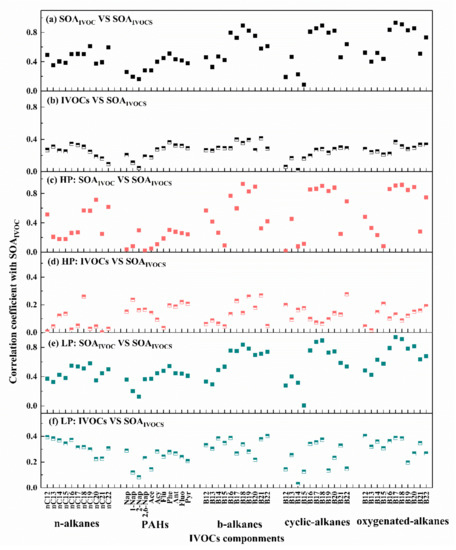 Correlation coefficient (r)of IVOCs components and its corresponding SOAIVOC with SOAIVOCs in haze episodes (black rectangle represents the haze episodes; pink rectangle represents HP stage; green rectangle represents LP stage; SOAIVOC represents the individual IVOC production, SOAIVOCs respesents the total IVOCs production) (a): SOAIVOC vs. SOAIVOCs and (b): IVOCs vs. SOAIVOCs, HP stages of haze. (c): SOAIVOC vs. SOAIVOCs and (d): IVOCs vs. SOAIVOCs and LP stages of haze. (e): SOAIVOC vs. SOAIVOCs and (f): IVOCs vs. SOAIVOCs.