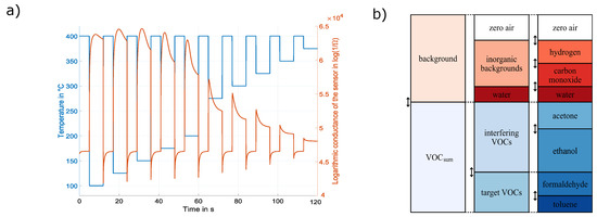 (a) Temperature-cycled operation ranging from 100–375 °C, together with one example of the logarithmic conductance of one sensor element (adapted from [13]) and (b) the gas composition for calibration containing background gases, as well as the target volatile organic compounds (VOCs) (adapted from [27]).