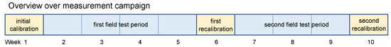 An illustration of the complete experiment over ten weeks, including calibration phases and field tests.