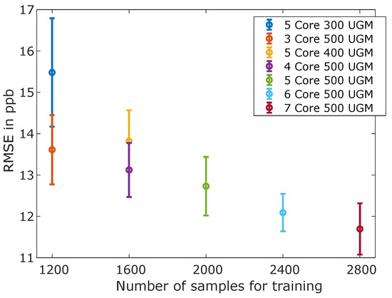 To determine the required complexity of the calibration (note that one hundred unique gas mixtures offered for 20 min each resulted in a total calibration time of 33 h; the extended calibration with higher VOC concentrations, therefore, required almost 7 d in total), the same model was built with fewer core samples and/or fewer unique gas mixtures to reproduce the results achieved in [33] and also to show the influence of more core samples compared to more unique gas mixtures (UGM).