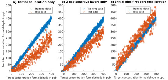Evaluation of the target gas formaldehyde over several weeks. Test data always consist of the data of the second part of the first recalibration. (a) Results based on training with initial calibration only. (b) Results based on training with initial calibration only, but without one gas-sensitive layer that shows large drift over time. (c) Results based on training with the initial calibration and the first part of first recalibration.