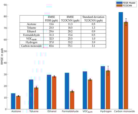 After validating the TCOCNN model in general, the results achieved for the laboratory tests with the deep-learning approach were compared with the FESR model published previously [13]. Therefore, TCOCNN models for all seven targets were trained with the help of the NAS on the initial calibration and the first part of the first recalibration to reduce the drift effects. The data split was performed as explained before (70% training, 10% validation, and 20% testing). For comparison, the RMSEs on the test data of the different models are compared for the different gases. This step allows comparing the prediction quality and capability of the different data-driven models.