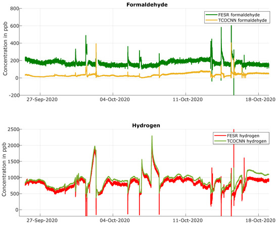 After showing that the TCOCNN can successfully predict the concentration of various gases in complex laboratory environments, this part focuses on quantifying the trained gases in a real indoor air environment. First, the general prediction quality of the TCOCNN for the various gases was compared to the predictions of the FESR model. Figure 7 illustrates the prediction of indoor air between September 26 and October 18 for formaldehyde and hydrogen. These two gases were chosen as they showed relevant aspects; the results for the other gases were similar. First, a constant offset was observed between both models, with the FESR model for formaldehyde indicating significantly higher concentrations than the TCOCNN model (average offset 140 ppb), while for hydrogen, the prediction of the TCOCNN was slightly higher with an average offset of 98 ppb. These differences were probably caused by the presence of additional gases in the room, which were not part of the calibration and were therefore not (fully) compensated by the data-based models and/or by the gas concentrations of the trained gases in the indoor environment outside of the trained ranges. Without reference measurements, it is not possible to determine which value is correct; in fact, both could be similarly off with one prediction being too high, the other too low. Nevertheless, at least for hydrogen, the baseline of the TCOCNN model seemed to be more realistic, as after ventilation events, the TCOCNN model indicated concentrations around 500 ppb, corresponding to the natural background level [39]. For formaldehyde as well, the lower average concentrations indicated by the TCOCNN model seemed more realistic, as the FESR model indicated concentrations well above the WHO recommended limit value of 80 ppb [40]. This will be investigated in the future with formaldehyde reference measurements as described in the relevant standards [40]. More importantly, however, both models were in agreement concerning the relative changes of the gas concentrations, which would be required to indicate changes in the indoor air quality, e.g., for demand-controlled ventilation.