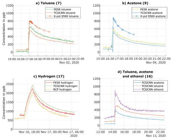 First, the releases of individual VOCs were analyzed in detail. Figure 8a illustrates the release of toluene on November 2 (Test 7). Both the FESR and the TCOCNN models predicted similar average concentrations over time, but with higher noise for the FESR model, as observed before. The FESR model indicated an increase of approximately 600 ppb, which is in accordance with the amount released, cf. (Table 2), while the TCOCNN indicated a slightly smaller increase of 500 ppb. In addition to the MOS gas sensors, the release was also monitored with the portable GC-PID (X-pid 9500), which indicated a similar rapid increase and slow decrease of the toluene concentration, but a higher absolute value with an increase of approximately 700 ppb. Note, however, that the limit of quantification (LOQ) for the X-pid 9500 is 1 ppm for toluene according to the manufacturer (500 ppb for acetone).