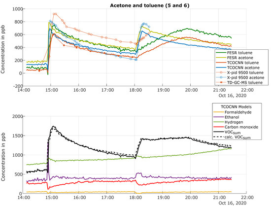 The outputs of the other TCOCNN models are shown in the lower part of Figure 9. Note that the trained VOCsum model (solid black line) actually showed a nearly identical behavior compared to adding the concentrations indicated by all four separate VOC models for acetone, ethanol, formaldehyde, and toluene with an increase of approximately 1100 ppb during the first combined release. The VOCsum model also showed the different evaporation speeds during the second release with a first fast increase caused by the release of acetone followed by an almost constant concentration due to the offsetting effects of increasing toluene and decreasing acetone concentrations.