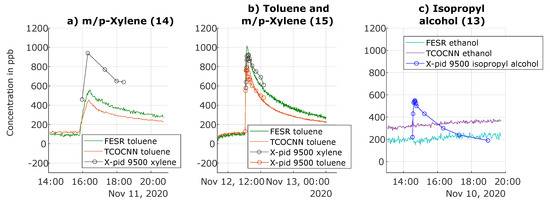 To further elucidate the selectivity of the various models, release tests were performed with gases not included in the calibration, but from the same chemical classes, i.e., m/p-xylene as a second aromatic compound and isopropyl alcohol as a second alcohol. Again, we compared the performance of the TCOCNN model with the FESR model. Figure 10 illustrates the predictions of both models calibrated for toluene during the release of m/p-xylene (Test Number 14). Both the FESR model and the TCOCNN model indicated a similar evolution over time of the toluene concentration. The indicated increase for the FESR was approximately 450 ppb, so again, close to the theoretically expected increase of 600 ppb, while the increase with the TCOCNN was slightly smaller with 350 ppb. The X-pid 9500, on the other hand, showed a large offset with a baseline value of almost 500 ppb and an increase similar to the FESR model. These results showed that both data-driven models were capable of quantifying aromatics, i.e., chemicals from the same chemical class as the calibrated toluene, in agreement with previous results for VOC identification [42]. The other VOC models were not influenced by the release of m/p-xylene, indicating good selectivity (see Figure A2 in Appendix A). The VOCsum model also responded to the release of m/p-xylene, again similar to toluene. Finally, a significant cross-sensitivity of the carbon monoxide model was also observed during the release of m/p-xylene, similar to the release of toluene.