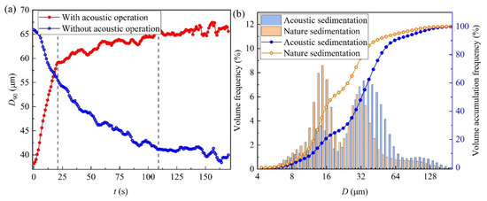 Figure 2b represents the averaged size spectrum and corresponding volume cumulative frequency spectrum of micro-droplets under natural sedimentation and acoustic field sedimentation. The number of control groups was 100, with 300 data points in each group. The peak of the size spectrum positively shifted with increasing particle size and spectrum width. The size spectrum under natural sedimentation had a bimodal distribution with peak values of 14 and 31 μm. The size spectrum width was 145 μm, and the droplet size was concentrated in the range of 4–149 μm. For cases with acoustic application, the particle size was mainly distributed in the range of 4–177 μm, with peak sizes of 14 and 34 μm. The volume frequency of the small-diameter particles decreased, whereas that of the large-diameter particles increased after the action of the acoustic waves. The volume frequency of micro-droplets smaller than 29 μm decreased by 30%. The acoustic waves only reduced and transferred the peak volume percentage, but did not change the peak shape.