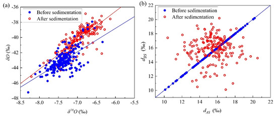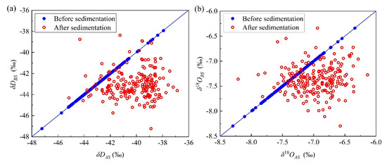 The variation in the d values before and after sedimentation is shown in Figure 6b, where the d values of the micro-droplet groups fluctuated after sedimentation, but the average value decreased. The average values of d before and after settlement were 15.88‰ and 15.48‰, respectively, which decreased by 0.40‰ after sedimentation. The d value is sensitive to the relative humidity of water vapors and is related to isotope exchange [26]. As presented in Section 3.3, the average increments of δD and δ18O were 2.81‰ and 0.40‰, respectively, after air chamber sedimentation, and the increment ratio was 7:1, which is less than 8:1, leading to a decrease in the d value of the micro-droplet groups.