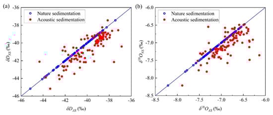 Based on the established isotope exchange equation between the micro-droplet groups and environmental water vapor, the isotope values of the micro-droplets were calculated theoretically using the calculation parameters listed in Table 1. Figure 9a shows that the calculated values of δ18O and δD were generally underestimated, but the isotope variation trends under different sedimentation conditions were consistent with the experimental trends. δD values under natural settlement conditions were in the range of −45.02‰ to −37.12‰, with an average value of −42.20‰, and the δ18O values were in the range of −8.02‰ to −6.22‰, with an average value of −7.24‰. The δD values under acoustic field settlement conditions were in the range of −46.19‰ to −36.84‰, with an average value of −41.50‰, and those for δ18O were in the range of −8.16‰ to −6.33‰, with an average value of −7.17‰. The calculated values of δD and δ18O increased by 0.70‰ and 0.07‰, respectively, under the action of acoustic waves, which is similar to the experimental values of δD that increased by 0.69‰.