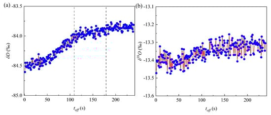 The isotope values of the environmental water vapor were also influenced by acoustic waves, and the temporal variations in δD and δ18O of environmental water vapor of 93 control groups were statistically analysed after stopping the acoustic waves (Figure 5). The isotope values of the environmental water vapor first increased and then stabilised with time when the acoustic waves were stopped. Isotope values of the environmental water vapor in the air chamber were influenced by the exchange rate, exchange surface area, and exchange state (equilibrium state or unbalanced state). As the surface area of the micro-droplet groups changed under acoustic operation, the isotope exchange balance was affected by the external energy of the acoustic waves. After the acoustic devices were stopped, the energy of the air chamber system decreased, and the equilibrium of isotope exchange on the acoustic field sedimentation condition was broken. Within the first 109 s of stopping the acoustic devices, the surface area of the micro-droplet groups increased, but the isotope exchange rate decreased. Thus, the δD of environmental water vapor increased gradually owing to the destruction of the equilibrium exchange state and the decrease in the exchange rate. Between 109–179 s, the variation in micro-droplet size stabilised, and the surface area and the δD of water vapor changed slightly. After stopping the acoustic operation for approximately 179 s, the equilibrium exchange between the micro-droplets and environmental water vapor was re-established, and the isotope exchange reached a dynamic equilibrium.