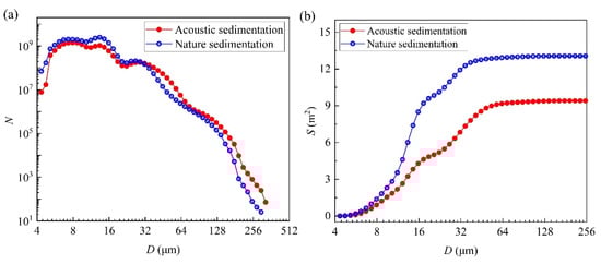 The micro-droplets input in the experiment was 0.36 g/s, and the sedimentation time was approximately 109 s. The distribution curve of the particle number and cumulative curve of the surface area are shown in Figure 7a,b, respectively. The smaller sizes dominated, and the number of droplets decreased with the increase in particle size, particularly for larger droplets (D > 64 μm). During the acoustic operation, the number of relatively smaller droplets (D < 29 μm) decreased, whereas that of larger droplets increased (D > 29 μm). After the action of acoustic waves, the number of smaller and larger droplets varied significantly, indicating that the acoustic waves caused the relatively smaller droplets to collide, agglomerate, and generate larger droplets [14,15,16,17]. As shown in Figure 7b, the surface area of the micro-droplet groups on the acoustic field settlement and natural settlement conditions were 9.41 and 13.06 m2, respectively, and decreased by 3.65 m2 after being exposed to the acoustic waves. As mentioned in Section 3.3, although the acoustic waves caused the contact area between the micro-droplet groups and environmental water vapor to decrease by 3.65 m2, the exchange rate of isotopes increased, resulting in an average increase of 0.69‰ for δD and 0.17‰ for δ18O.