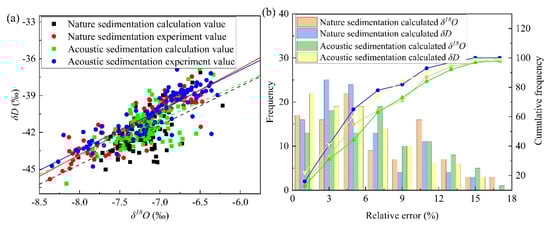 Taking the experimental values as standard, the relative error frequencies of δ18O and δD are shown in Figure 9b. It was observed that the relative error was mainly concentrated within 15% and the δD frequency of the relative error within 6% was higher than that of δ18O. For natural settlement conditions, the cumulative frequencies of δD and δ18O of the relative error less than 11% were 87 and 93, respectively (the total frequency was 100). For the acoustic field settlement conditions, the cumulative frequencies of δD and δ18O of the relative error less than 11% were 84 and 90, respectively.