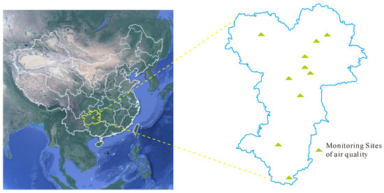 Guiyang is situated in the central part of Guizhou Province in the Yunnan-Guizhou Plateau in Southwest China, between 106°07′–107°17′ E and 26°11′–26°55′ N. As of November 2020, Guiyang has a resident population of 497.14 million and an urban population of 378.47 million, with its urbanization rate reaching 76.13%. At present, 10 national control sites dedicated to ambient air monitoring (Figure 1) have been set up in Guiyang city by the China Environmental Monitoring General Station, so as to monitor the concentrations of air pollutants and the changes in air quality. The method of air quality monitoring is practiced according to the Environmental Quality Standard (GB3095-2012). The monitoring instrument is calibrated regularly according to the Technical Specification for Automatic Monitoring of Environmental Quality (HJ/T193-2005) in order to ensure the accuracy of monitoring data. The data of pollutant concentrations as monitored at each station were published online in real time (http://www.aqistudy.cn/ (accessed on 9 March 2020); http://data.epmap.org/ (accessed on 9 March 2020)). The criteria air pollutants chosen for this study include PM2.5, PM10, SO2, NO2, CO, and O3. The advantage of using ground-based observational data is that they are more sensitive to the changes in emission sources and more relevant to human exposure and health risks [20]. In addition, meteorological observation data were collected to study the effect of meteorological changes on the concentrations of air pollutants. Meteorological parameters including sunshine duration (SD), temperature (T), wind speed (WS), relative humidity (RH), precipitation (P), and atmospheric pressure (AP) were obtained from the National Basic Meteorological Station of Guiyang City (WMOID = 57816) (http://data.cma.cn/user/toLog in.html/ (accessed on 9 March 2020)).