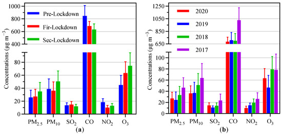 (a) Stage mean concentrations of air pollutants before and during the COVID-19 periods in 2020. (b) comparison of pollutant concentrations during the Fir-Lockdown period in 2020 with previous year of 2019, 2018, and 2017. Error bars indicate the standard deviations over multiple days (2020: the Fir-Lockdown period in 2020; 2019–2017: the same lunar period in 2019, 2018 and 2017 compared with the Fir-Lockdown period in 2020, respectively).