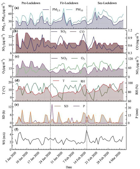 Daily mean pollutant concentrations and meteorological parameters from 3 January 2020 to 8 March 2020 in Guiyang city. (a) PM2.5, PM10, (b) SO2, CO, (c) NO2, O3, (d) T: temperature, RH: relative humidity, (e) SD: sunshine duration, P: precipitation, (f) WS: wind speed.