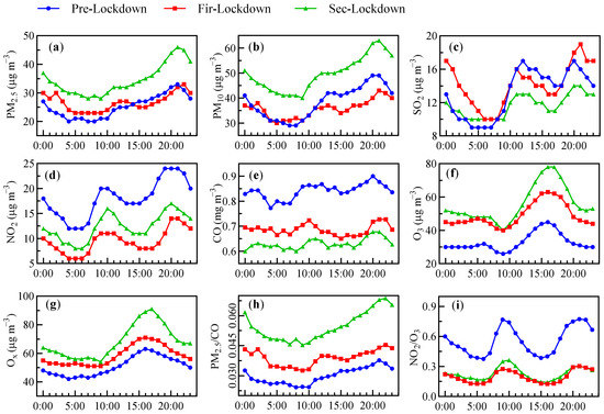 Hourly mean values of air pollutants and its ratios in a day during the Pre-Lockdown, Fir-Lockdown, and Sec-Lockdown stage. (a) PM2.5, (b)PM10, (c) SO2, (d) NO2, (e) CO, (f) O3, (g) Ox, (h) PM2.5/CO, (i) NO2/O3.