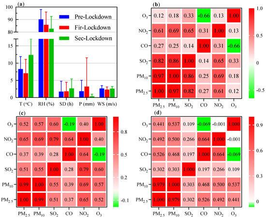 (a) Comparison of mean meteorological parameters during the Pre-Lockdown, Fir-Lockdown, and Sec-Lockdown stage, error bars indicate the standard deviations over multiple days. (b–d) Correlation heat map among daily mean concentrations of pollutants during the Pre-Lockdown, Fir-Lockdown and Sec-Lockdown period, respectively.