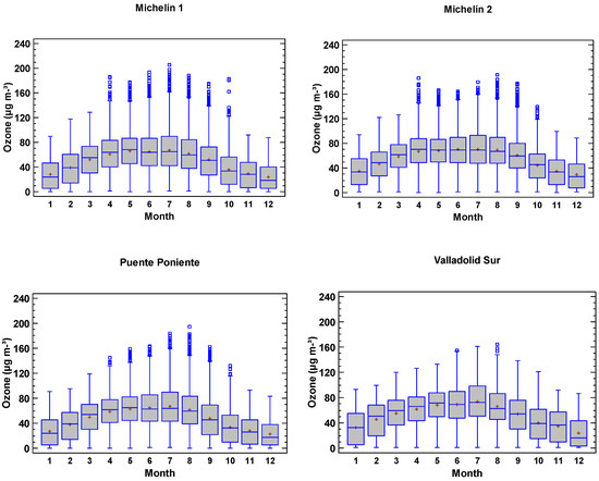 The monthly mean pattern over the study period is shown in Figure 4 on an hourly basis, and is similar to those recorded at Mediterranean locations [26,27]. Ozone levels increased during the first months of the year for all the measuring stations, and reached the maximum value in July, which is mainly associated with the photochemical period [28] characterised by dry and sunny weather conditions. There was a secondary peak in May and June whose origin is not as clear. It might be related to stratospheric–tropospheric interchange, which generally occurs between January and June, the increase in solar radiation and the long-range transport of ozone [2,12,29]. Data variability was higher between April and August, and especially in July with the greatest interquartile range, around 47 µg m−3. Many outliers were obtained in spring and summer months, except at Valladolid Sur. After also evidencing high values in August, concentrations then decreased until the end of the year. The highest mean monthly ozone concentrations ranged between 66.7 µg m−3 at Puente del Poniente and 73.8 µg m−3 at Valladolid Sur. The seasonal variation found in ozone for the measuring stations can be associated to different factors, mainly local conditions within the city. Average mean values for the secondary peak were about 69 µg m−3 at Michelín 2 and Valladolid Sur, 65 µg m−3 at Michelín 1 and Vega Sicilia, and 63 µg m−3 at Puente del Poniente. The lowest levels, around 28 µg m−3 at Michelín 2 and 24 µg m−3 for the rest of the stations, were found in December.
