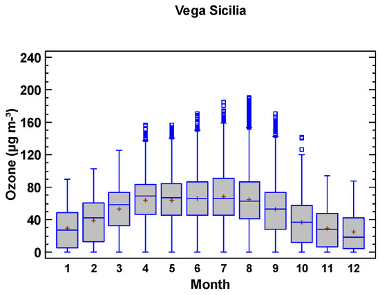 The year-to-year comparison for the measuring stations can be analysed from the box and whisker plot of Figure 2. There are several components in the graph to assess the results obtained. Fifty percent of data are within the vertical box between the lower and upper quartiles. The upper and lower whiskers extend out to the extreme maximum and minimum values below or above 1.5 times the interquartile range from the first and third quartiles. Small squares correspond to outliers. The cross and horizontal lines inside the box represent the median and mean values, respectively. As can be seen from the graphs, the highest average values were obtained in 2018 for all the stations, with values ranging between 54.2 µg m−3 (Puente del Poniente) and 57.6 µg m−3 (Valladolid Sur), except at Michelín 2, with 62.2 µg m−3 in 2002. In general, high concentrations associated to outliers were found in 2003 for most measuring stations, excluding Valladolid Sur. In regard to the lowest mean values, there was no common year, with the lowest being 2003, 2009, 2017 and 2006 at Michelín 1, Michelín 2, Valladolid Sur and Vega Sicilia, respectively, with values between 40.4 and 49.1 µg m−3. The low number of data recorded in 2002 at Puente del Poniente probably conditioned the low mean value of ozone concentration.