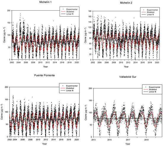 A similar procedure was applied for the maximum daily 8 h average of ozone, but with using t as the time in consecutive days and ω the frequency 2π/365.242 (rad day−1) and was also analysed for each station. The evolution of this indicator in the study period is shown in Figure 6. Although the coefficients of determination were between 57.8 and 64.6% for Michelín 2 and Puente del Poniente, respectively, they were statistically significant at a 95% confidence level. The trend was negative for Michelín 2 (−0.001 µg m−3 day−1) and Valladolid Sur (−0.0004 µg m−3 day−1). However, ozone concentrations increased for the rest of the stations. The trend value was greater for the measuring station located further inside the city, Puente del Poniente, around 0.0009 µg m−3 day−1, and a less strong increase, up to 0.0005 µg m−3 day−1, was obtained for Michelín 1 and Vega Sicilia.