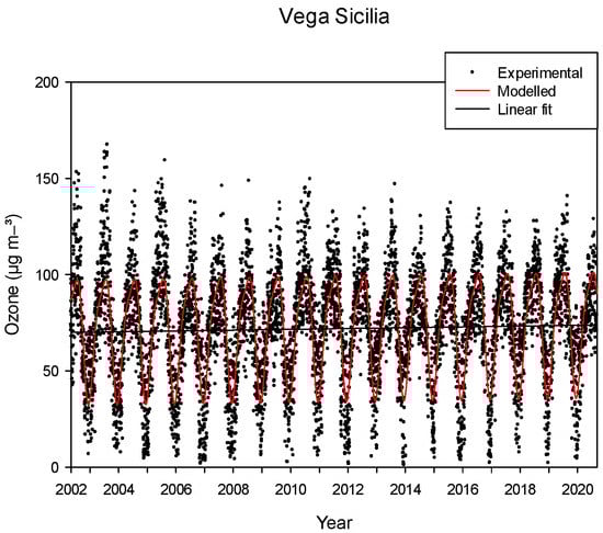Evaluation of the urban air quality of the study area in accordance with regulatory standards confirmed that only on rare occasions did ozone levels exceed current air quality regulations, which establish 180 µg m−3 as the information threshold. Moreover, the threshold for the protection of human health, 120 µg m−3, was not exceeded at any measuring site. This is of particular importance with regard to tropospheric ozone pollution in the city and the protection of the population’s health. The last five-year average of AOT40 did not surpass the limit for the protection of vegetation. The results can help to improve current knowledge of the temporal variability and ozone trend in southern Europe.