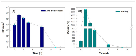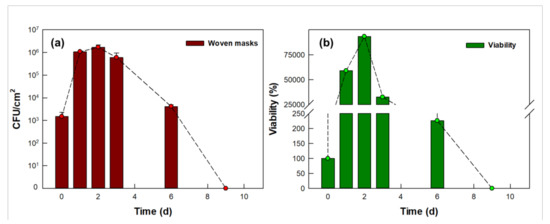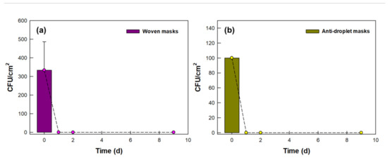 - Bin Jeong, S.; Heo, K.J.; Ko, H.S.; Ahn, J.P.; Lee, S.; Jung, J.H. Evaluation of survival rates of airborne microorganisms on the filter layers of commercial face masks. Indoor Air 2021, 31, 1134–1143. [Google Scholar] [CrossRef]