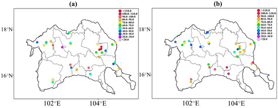 Geographical distribution of the rainfall accumulation on (a) 28 July 2017 and, (b) 30 August 2019.