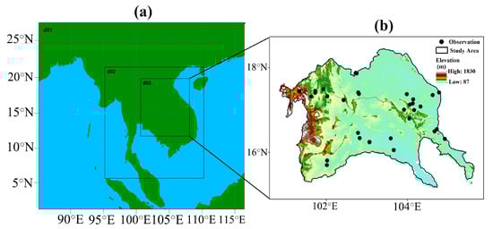 Model domains used for assimilation experiments. (a) Model domains. Domains 1–3 denote, respectively, d01, South East Asia used to assess observed assimilation, d02, Thailand, used to assess observed assimilation, and d03, the Kong-Chi basin (KCB), used for evaluation; (b) observations for evaluating the KCB.