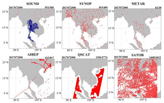 Spatial distribution of the observations used in assimilation experiment PREPBUFR (red dot) + AWS (blue dot) for South East Asia at 00UTC 25 July 2017. The number of observations assimilated in the WRFDA model and that of total observations available at the time of assimilation are indicated at the top right corner of each plot.