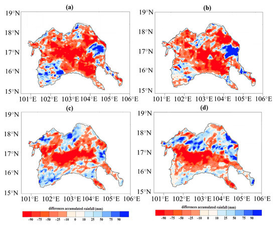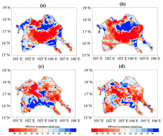 Differences (model observation) in accumulated rainfall in both experiments of the PODUL event. (a) DAALL-72h, (b) DAAWS-72h, (c) DAALL-48h, and (d) DAAWS-48h.