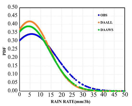 Probability distribution function (PDF) of accumulated rainfall every 3 h.