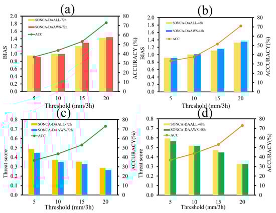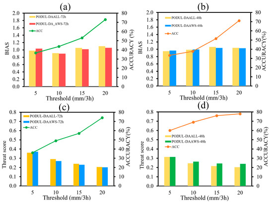 For the PODUL event, as shown in Figure 8, the DAALL and DAAWS bias values with 72 and 48 h lead times (see Figure 8a,b) are closer to 1 with all rainfall thresholds, which indicates that the assimilation experiment reduces overforecasts and achieves high performance for this event. However, Figure 8c,d verify that the TS values of both experiments are lower than 0.4 with all rainfall thresholds, which indicates that the forecast has lower performance. In general, the successes of ACC and TS tend to decrease as the forecast time increases and also rainfall thresholds increase, as expected.