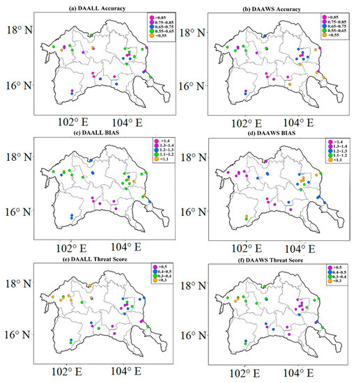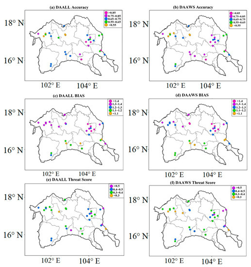 The results for the PODUL event are shown in Figure 10. The accuracy values of DAALL (Figure 10a) and DAAWS (Figure 10b) are similar ranging from 0.75 to 0.85, but the accuracy in the southwest of the KCB using DAAWS is higher compared to DAALL values in the range of 0.65 to 0.75. At the same time, the bias scores of DAALL and DAAWS (Figure 10c,d) are approximately 1.2 in the south of the KCB. One issue that contributes to these large values, is that the model tends to overforecast accumulated rain, as shown in Figure 7b and Figure 8b. The threat scores of DAALL (Figure 10e) and DAAWS (Figure 10f) are very similar to the values ranging from 0.3 to 0.5 in the KCB with a 48 h lead time.