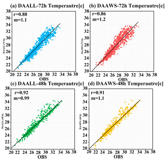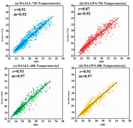 Scatterplots of temperature (T) of the observed vs. the 72 h and 48 h lead times for PODUL event. (a,c) DAALL; (b,d) DAAWS. The linear regression line is plotted, and its slope m is presented along with the correlation coefficient r in the top-left corner of each scatterplot.