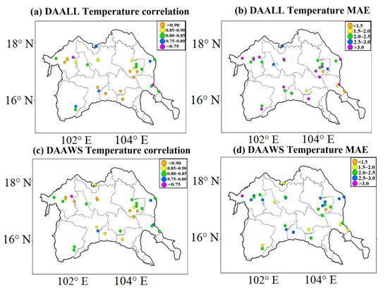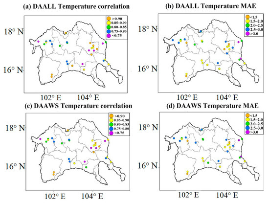 Geographical distribution of the temperature statistical scores average with a 48 h lead time for the PODUL event. (a,b) Correction and MAE of DAALL T, and (c,d) correction and MAE of DAAWS T.