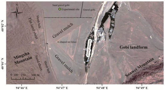 The Mogao Grottoes, located approximately 25 km southeast of Dunhuang City, were built on the south-north-oriented steep cliff, which is approximately 1680 m long with a relative height of 10–45 m on the west bank of the Daquan River []. They border Sanwei Mountain to the east and Mingsha Mountain to the west, which is a huge and complex megadune located atop the grottoes, and is the main sand source threatening the grottoes. The landforms on the top surface of the Mogao Grottoes consist of four types, namely: Sandy Gobi, gravel Gobi, flat sand sheets, and megadunes. The research area was situated on the flat sandy Gobi surface atop the grottoes (Figure 1).