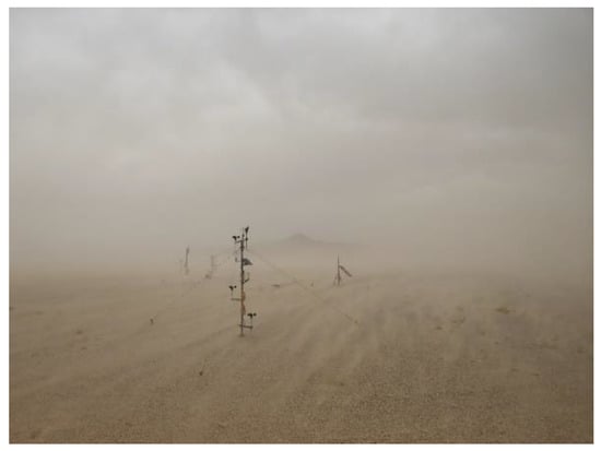 Gobi is a desert landscape covered with gravel and mainly distributed in arid regions of Northwest China and Southern Mongolia. In addition, it covers an area of 72 × 104 km2 in China, which is comparable with the area of desert [,]. This type of surface is also known as gibber plains or stony mantles in Australia, and as desert pavements in the USA []. Gobi is mostly distributed in strong wind areas with high intensity of sand transport. Therefore, it is an important potential source of global dust emission [,].